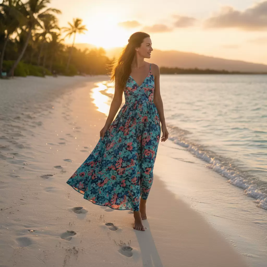 Váy maxi từ lâu đã trở thành “biểu tượng” của thời trang đi biển. Với thiết kế dáng dài thướt tha, chất liệu mềm mại như lụa, voan hay ren, váy maxi giúp che đi những khuyết điểm đôi chân và tôn lên vẻ nữ tính, dịu dàng. Bạn nên ưu tiên các mẫu váy có thiết kế hở lưng, xẻ tà hoặc cổ chữ V để tăng thêm sự gợi cảm một cách tinh tế. Đừng quên chọn những gam màu tươi sáng như trắng, vàng, hoặc xanh pastel để hòa mình vào không gian bao la của biển cả.