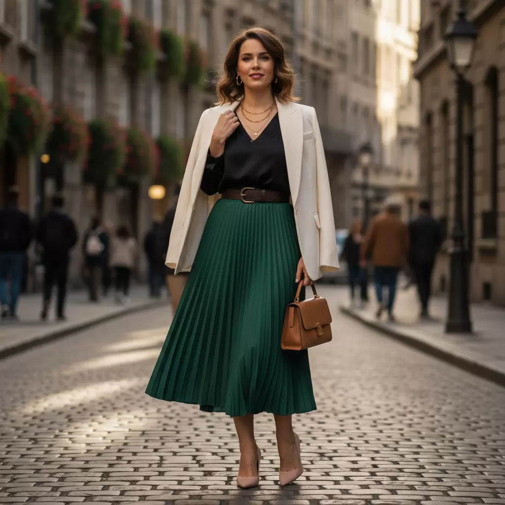Bên cạnh đó, chân váy xếp ly với những đường thẳng đứng cũng là một gợi ý trang phục cho nàng dáng quả lê. đáng cân nhắc vì chúng tạo hiệu ứng thị giác giúp đôi chân trông dài và thon gọn hơn. Bạn nên tránh các kiểu chân váy có túi hông to, đính đá hoặc có họa tiết kẻ ngang ở vùng mông vì chúng sẽ làm phần dưới trông đồ sộ hơn.