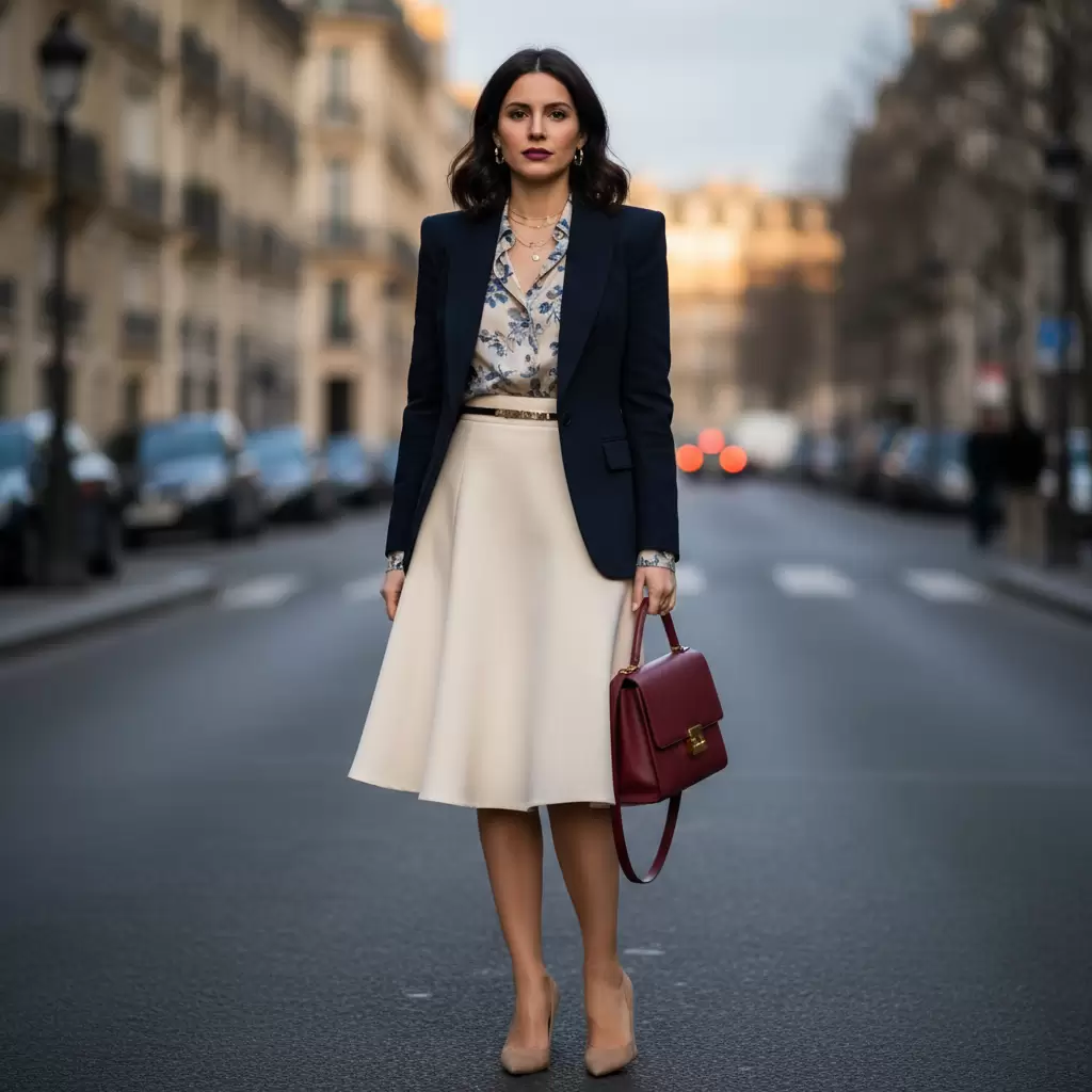 Nguyên tắc cơ bản của việc phối đồ cho dáng người tam giác ngược (vai rộng hông hẹp) là thêm khối lượng cho phần thân dưới. Khi bạn mặc một chiếc chân váy xòe dáng chữ A, váy xếp ly hoặc quần ống suông rộng, phần hông sẽ trông đầy đặn hơn. Sự gia tăng kích thước ở phía dưới này sẽ tạo ra một tỷ lệ cân bằng với đôi vai rộng phía trên, tạo nên đường cong đồng hồ cát ảo. Đây là cách phối đồ cực kỳ hiệu quả giúp che giấu khuyết điểm vai thô một cách tự nhiên nhất.